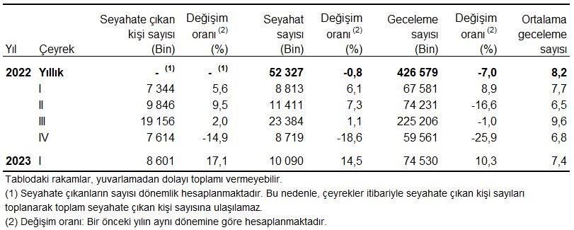 TUİK Yurt İçi Turizm, I. Çeyrek: Ocak-Mart, 2023 yurt içi turizm verilerini açıkladı. Buna göre; yurt içinde ikamet eden 8 milyon 601 bin kişi seyahate çıktı ve geçen yılın aynı dönemine göre yüzde 82,8 artış yaşandı.