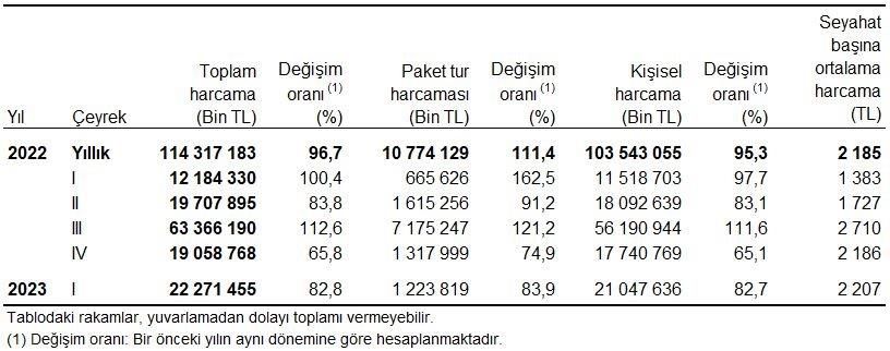 Yerli turistlerin, yurt içindeki seyahat harcamaları 2023 yılının I. çeyreğinde bir önceki yılın aynı çeyreğine göre %82,8 artarak 22 milyar 271 milyon 455 bin TL oldu. Bu harcamaların %94,5’ini 21 milyar 47 milyon 636 bin TL ile kişisel harcamalar, %5,5’ini ise 1 milyar 223 milyon 819 bin TL ile paket tur harcamaları oluşturdu. Seyahat başına yapılan ortalama harcama ise 2 bin 207 TL oldu.