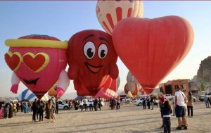“Kalp,” “dondurma”, “ördek”, “Oburiks”, “ahtapot”, “Türk bayrağı” gibi çeşitli figürlerdeki sıcak hava balonları peribacalarıyla kaplı vadilerin üstünde süzüldü.